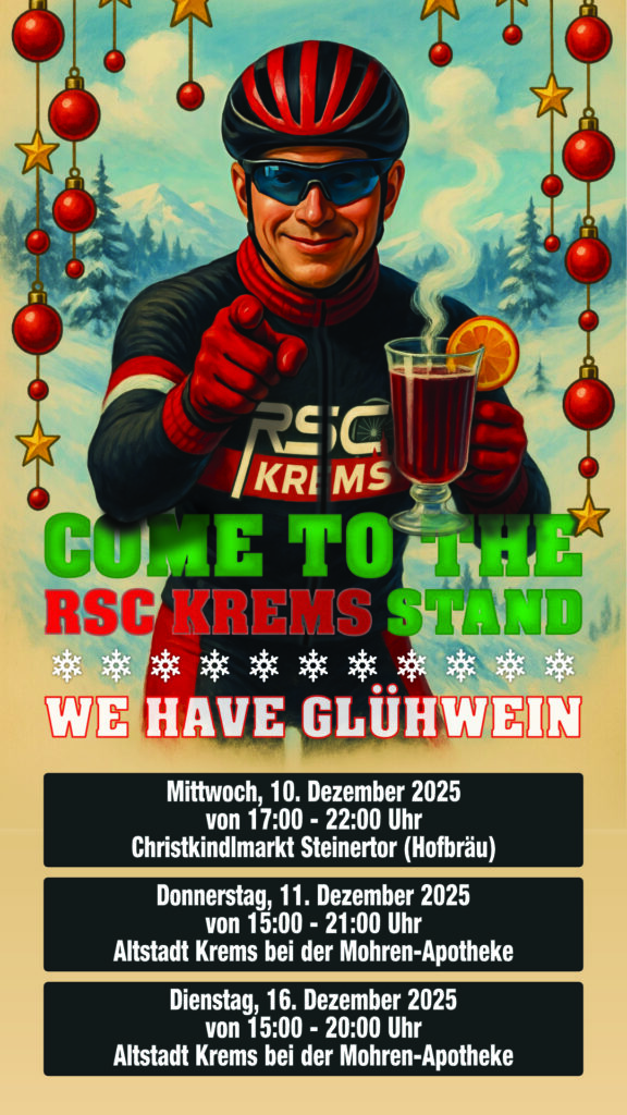 Der RSC Krems ist auch heuer wieder für euch am Glühweinstand des Kremser Sport in der Innenstadt (Obere Landstraße bei der Mohren-Apotheke) sowie am Christkindlmarkt am Steinertor beim Hofbräu vertreten.